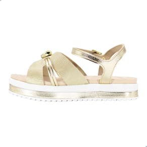 A sandália perfeita para deixar o look das pequenas cheio de brilho e encanto! Com design delicado, essa sandália infantil apresenta tiras metalizadas douradas e um lindo laço com aplique de coração na parte frontal, trazendo um toque sofisticado e divertido ao mesmo tempo.