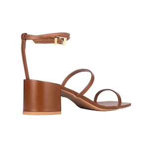 A sandália confeccionada em material confort é um modelo que combina estilo e praticidade. Com bico quadrado e salto médio bloco, design inclui tiras finas e uma tira adicional que contorna o tornozelo, com fechamento em fivela proporcionando ajuste elegante.