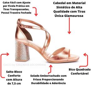O salto bloco confere estabilidade e elegância, permitindo que você se destaque com confiança em qualquer ocasião. O conforto é a essência desta sandália, graças à sua palmilha macia e acolchoada, que garante uma experiência agradável durante todo o dia, seja no trabalho, em eventos sociais ou em um passeio descontraído.