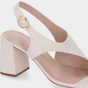O modelo traz uma proposta minimalista e elegante, com foco no conforto e na estética refinada. A combinação do salto bloco com o aplique dourado oferece charme e versatilidade para diferentes ocasiões.