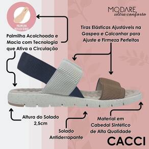 A Sandália Modare Ultraconforto possui em sua palmilha gomos massageadores com Aloe Vera que proporcionam um conforto extremo aos seus pés, seu cabedal é feito de nylon. O solado é de borracha e possui um solado com 3,5cm além de ser antiderrapante.