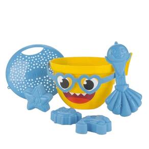 O baldinho possui também a pá no formato de concha e 3 forminhas para a criança brincar na areia em formatos de criaturas do mar, além de uma peneira que também faz o fechamento do balde para transporte. A alça possui o detalhe dos óculos para a criança interagir, colocando ou tirando os óculos do Baby Shark.