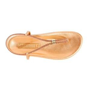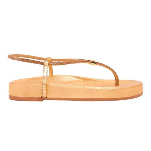 Sandália Papete metalizada confeccionada em material metallic soft. Possui salto flat, bico redondo e se destaca pelas tiras finas adornadas com brilhos em strass. Ideal para adicionar um toque de glamour a qualquer look.