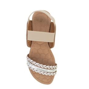 Nome: Sandália Primícias 502. Gênero: Feminino. Indicado Para: Moda-Dia a dia. Estilo da Peça: Casual. Ocasião: Dia a dia. Material Externo: Alternativo. Detalhes: Tiras trançadas e com brilho no cabedal. Ajuste: Tiras elásticas. Palmilha: Com texturas. Solado: Borracha antiderrapante. Peso do Produto: 524 g (o peso varia de acordo com a numeração). Garantia do Fabricante: Contra defeito de fabricação. Origem: Nacional. Código Produto: 02040738. Marca: Primícias. Ean: 7890017973847