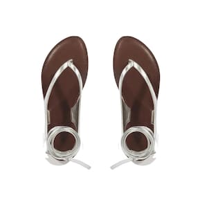 Essa confortável sandália rasteira prata traz uma proposta sexy e sofisticada para seus looks de verão! O design clean em couro metalizado traz elegância imediata, enquanto as tiras tipo thong sandal e o fechamento com amarração de fita no tornozelo deixam esse modelo super cool. Aposte!
