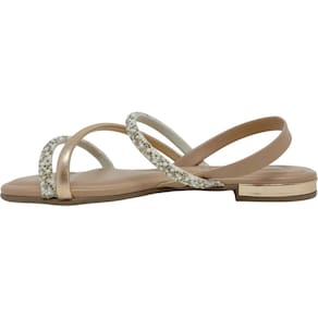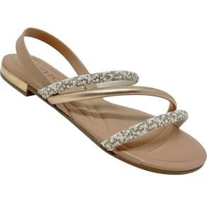 Confeccionada com material sintético de alta qualidade, garantindo não apenas beleza, mas também durabilidade para acompanhar você em todas as suas jornadas. Seu design apresenta uma biqueira arredondada e um cabedal aberto, composto por três tiras finas e elegantes. O toque de sofisticação vem das duas tiras decoradas com brilhantes strass, que adicionam um charme sutil e um brilho cativante ao seu visual.