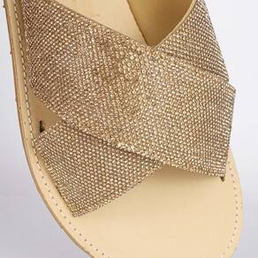 Sandália Rasteira, confeccionada em material cristal. Possui solado flat, bico arredondado, palmilha texturizada com o logotipo da marca e se destaca pelas tiras cruzadas com detalhes em brilho.