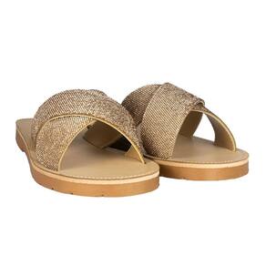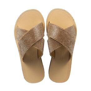Sandália Rasteira, confeccionada em material cristal. Possui solado flat, bico arredondado, palmilha texturizada com o logotipo da marca e se destaca pelas tiras cruzadas com detalhes em brilho.