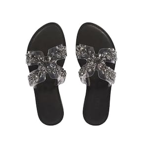 Essa sandália rasteira preta combina a praticidade do modelo slide com o glamour da aplicação de pedras sobre o vinil transparente, material que adiciona um toque trendy ao visual. Sabe aquele modelo fácil de usar e que faz toda a diferença no look? É essa sandália glam!