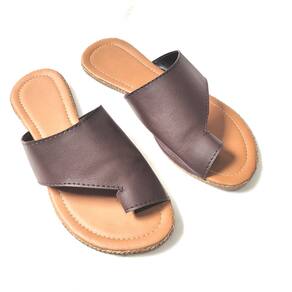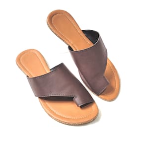Sandália Rasteira Café de Dedo em couro sintético, palmilha macia e solado em PVC.