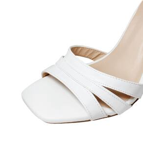 Linha de Sandália Salto Alto Fino Luiza Sobreira, produzida em material sintético na cor Branca, com palmilha e forro em P.U., solado em TR, bico quadrado e fivela ajustável para fechamento.