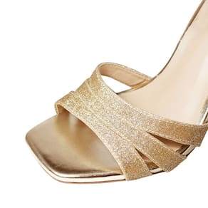 Linha de Sandália Salto Alto Fino Luiza Sobreira, produzida em material sintético na cor Gliter Dourado, com palmilha e forro em P.U., solado em TR, bico quadrado e fivela ajustável para fechamento.