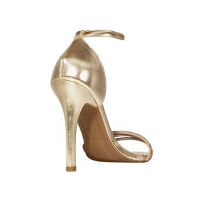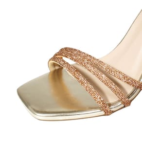 Linha de Sandália Salto Alto Fino Luiza Sobreira, produzida em material sintético metalizado na cor Dourada com detalhes em strass, com palmilha e forro em P.U., solado em TR, bico quadrado e fivela ajustável para fechamento.