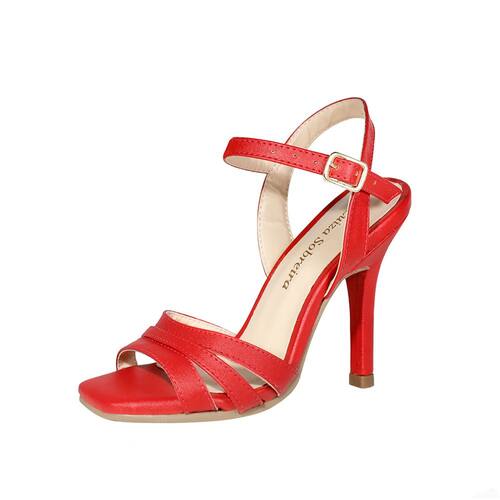 Linha de Sandália Salto Alto Fino Luiza Sobreira, produzida em material sintético na cor Vermelha, com palmilha e forro em P.U., solado em TR, bico quadrado e fivela ajustável para fechamento.