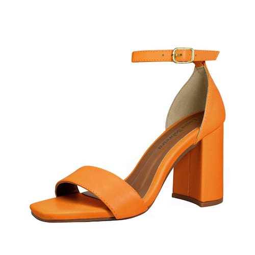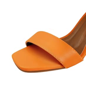 Linha de Sandália Salto Alto Grosso Luiza Sobreira, produzida em material sintético na cor Laranja, com palmilha e forro em P.U., solado em TR, bico quadrado e fivela ajustável para fechamento..