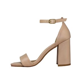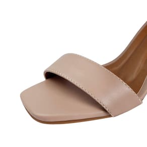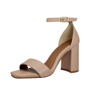 Linha de Sandália Salto Alto Grosso Luiza Sobreira, produzida em material sintético na cor Nude, com palmilha e forro em P.U., solado em TR, bico quadrado e fivela ajustável para fechamento..
