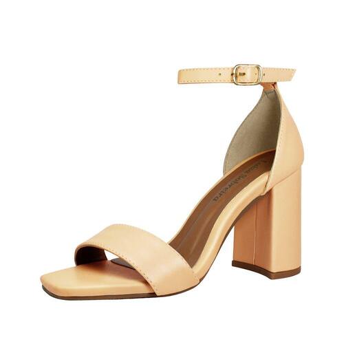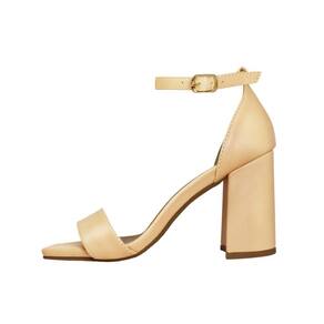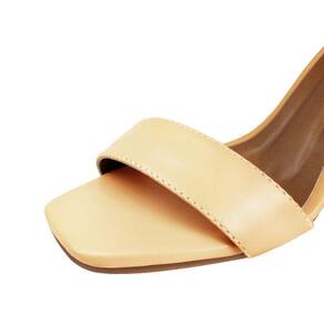 Linha de Sandália Salto Alto Grosso Luiza Sobreira, produzida em material sintético na cor Nude, com palmilha e forro em P.U., solado em TR, bico quadrado e fivela ajustável para fechamento..