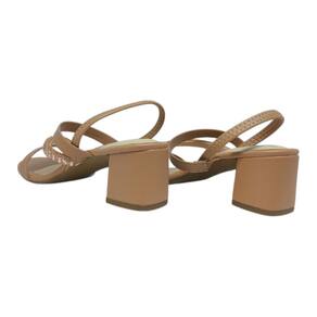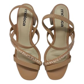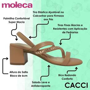 Seu cabedal é fabricado em material sintético, tem no peito do pé 3 tiras e uma decorada com strass. O salto é médio, bloco e acabamento no mesmo material do cabedal, possui aproximadamente 5 cm de altura é estável proporcionando conforto ao caminhar, o solado é emborrachado e possui frisos para maior segurança, a palmilha é fixa, almofadada e apresenta a logo da marca, o calcanhar é aberto e o fechando é por tira melavél no tornozelo facilitando o calçe.