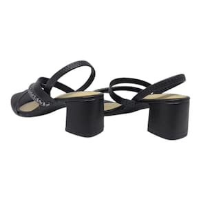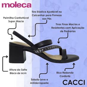 Seu cabedal é fabricado em material sintético, tem no peito do pé 3 tiras e uma decorada com strass. O salto é médio, bloco e acabamento no mesmo material do cabedal, possui aproximadamente 5 cm de altura é estável proporcionando conforto ao caminhar, o solado é emborrachado e possui frisos para maior segurança, a palmilha é fixa, almofadada e apresenta a logo da marca, o calcanhar é aberto e o fechando é por tira melavél no tornozelo facilitando o calçe.