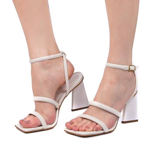 Com um salto em formato de triângulo grosso e um bico quadrado, esta sandália oferece elegância e conforto a cada passo. As tiras finas com fecho de fivela garantem um ajuste seguro e personalizado.