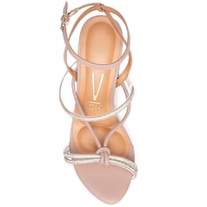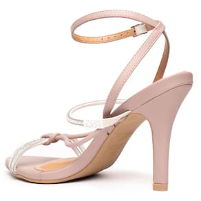 O solado em PVC, projetado com materiais de alta qualidade, é leve e durável, proporcionando estabilidade e aderência. Conta com um salto alto de formato fino e 8,0 cm de altura aproximadamente. O design desta sandália é versátil, adequado para diversas estações do ano, e o acabamento é impecável em cada detalhe, refletindo a qualidade superior.