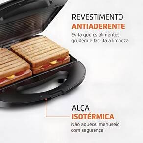 CARACTERÍSTICAS: - Cor: Preta - Voltagem: 110V - Potência: 750W - 2 em 1: Prepara deliciosos lanches e grelhados - Grelhas duplas: Grelham por igual os dois lados do alimento - Revestimento antiaderente: Os alimentos deslizam com mais facilidade - Trava de fechamento: Permite perfeita acomodação dos alimentos no interior do grill - Lâmpada piloto: Indica o funcionamento do aparelho - Controle de temperatura automático: Garante resultados perfeitos para os seus grelhados e sanduíches - Você pode preparar: carnes, legumes, sanduíches e muito mais