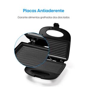 Além disso, a sanduicheira possui indicação luminosa, enrolador de fio, base antiderrapante e proteção contra superaquecimento, oferecendo praticidade, segurança e durabilidade.