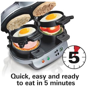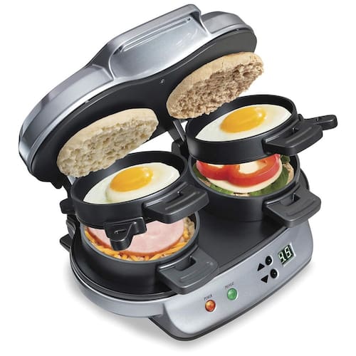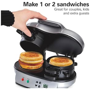 Sanduicheira dupla Hamilton Beach com cronômetro, 1200W, ideal para preparar sanduíches rápidos em 5 minutos. Possui peças removíveis e laváveis.Funciona como grill