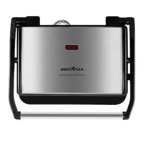 Sanduicheira e Grill Britânia 2 em 1 com chapas antiaderentes, 850W de potência, trava de segurança, alça com toque frio e placas ajustáveis.Funciona como grill