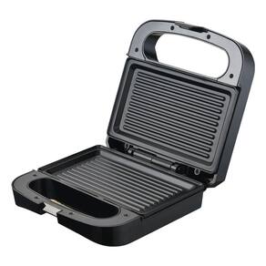 Sanduicheira e Grill com 750W de potência, revestimento antiaderente, trava de segurança, pés antiderrapantes, design compacto, controle de temperatura automático, luz indicadora de funcionamento (vermelha/verde), cabo de energia ajustável para armazenamento prático.Funciona como grill
