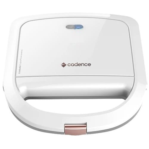 Sanduicheira elétrica Cadence com acabamento em rosé gold, capacidade para dois sanduíches, chapas antiaderentes, duplo aquecimento, alça isotérmica, porta fio, led luminoso, termostato, pés antiderrapantes e trava de segurança.Funciona como grill