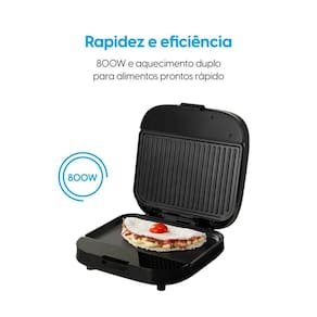 Duas chapas com formatos diferentes (funda e ondulada), sistema de aquecimento duplo, revestimento antiaderente, botão liga/desliga com LED indicador, trava de fechamento, proteção contra superaquecimento, pés antiderrapantes, armazenamento vertical.Função Grill