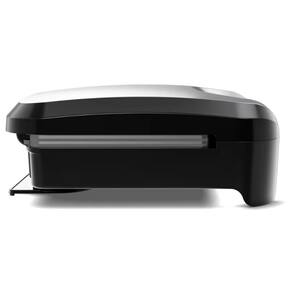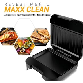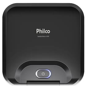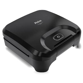 Sanduicheira e Grill Philco 2 em 1 com 750W de potência, chapa grill superior e lisa inferior, revestimento antiaderente, suporte para armazenar o cordão, botão liga/desliga e luzes de funcionamento e aquecimento.Porta-fio