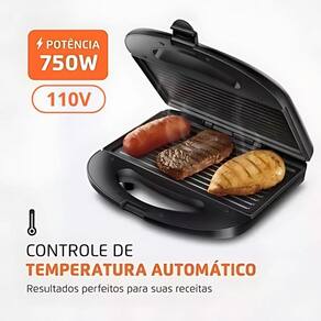 CARACTERÍSTICAS: - Cor: Preta - Voltagem: 110V - Potência: 750W - 2 em 1: Prepara deliciosos lanches e grelhados - Grelhas duplas: Grelham por igual os dois lados do alimento - Revestimento antiaderente: Os alimentos deslizam com mais facilidade - Trava de fechamento: Permite perfeita acomodação dos alimentos no interior do grill - Lâmpada piloto: Indica o funcionamento do aparelho - Controle de temperatura automático: Garante resultados perfeitos para os seus grelhados e sanduíches - Você pode preparar: carnes, legumes, sanduíches e muito mais Marca: Não Informado