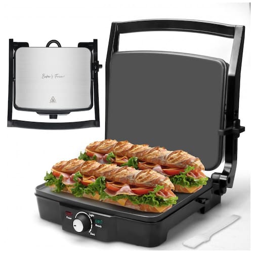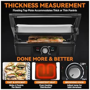 Corpo em aço inox com placas antiaderentes livres de BPA, PFOA e PTFE. Tecnologia de aquecimento pré-aquece rapidamente e mantém temperatura constante. Funcionalidades incluem modo manter aquecido, escova de limpeza e compatibilidade com pães finos ou ciabatta grossa. Indicada para refeições familiares ou preparos rápidos.Funciona como grill