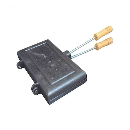 Sanduicheira Pão de Forma Dupla de Ferro Fundido, com cabo de madeira. Medidas: 21x12cm. Altura: 3,5cm. Comprimento Total com Alças/Cabos: 40cm. Peso: 1,96kg.Termostato regulável