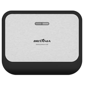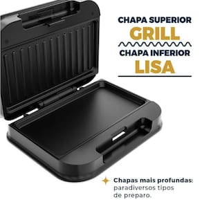 Sanduicheira Britânia Quadratt Grill 750W com design moderno, chapas antiaderentes (superior tipo grill e inferior lisa), trava de fechamento, base antiderrapante e luzes indicadoras de funcionamento e aquecimento.Funciona como grill