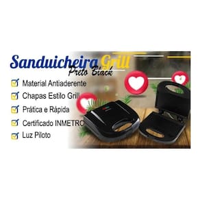 Sanduicheira torradeira tostex grill black agratto 220v Voltagem 220v Prepare sanduíches deliciosos com muita praticidade com a sanduicheira e grill da agratto. Saboreie lanches deliciosos e saudáveis com praticidade e rapidez. A sanduicheira e grill agratto é perfeita para preparar aquele lanche ou um bom grelhado, tudo com muita praticidade. É fácil de usar, é fácil de limpar. Chapa grill Você pode preparar vários tipos de sanduíches, ou mesmo grelhar carnes leves. Luz indicadora As luzes indicam quando a sanduicheira está ligada ou em aquecimento. Fácil de limpar - as chapas possuem camada antiaderente, facilitando na hora de retirar os alimentos e da limpeza. - acabamento bonito e elegante em inox. Informações técnicas Potência: 750w Frequência: 60 hz Acabamento em plástico
