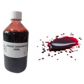 sangue teatral, para cinema, tv, artificial. Muito utilizado como complemento na criação dos efeitos de cortes, feridas, queimaduras etc. . . O sangue não deixa manchas, é de fácil remoção da pele, pode ser utilizado na boca uso externo e é hipoalergênico. Conteúdo: 500ml