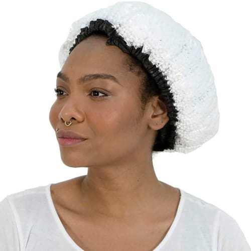 Também pode ser usada no banho. Com as bolinhas de isopor a touca auxilia no massageamento e relaxamento do couro cabeludo.