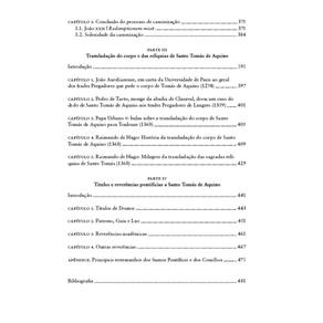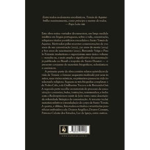 Este livro reúne uma série de documentos, em larga medida inéditos em língua portuguesa, sobre a vida, canonização, relíquias e títulos pontifícios concedidos a Santo Tomás de Aquino. Motivados pelas recentes comemorações de 700 anos de sua canonização (2023), 750 anos de morte (2024) e 800 anos de nascimento (2025), Bernardo Veiga e Paulo Faitanin traduziram e organizaram, num único volume que, deve-se dizer, representa a mais ampla e significativa documentação já publicada no Brasil a respeito do Santo Doutor , um sem-número de materiais biográficos, eclesiásticos e canônicos. A primeira parte contém relatos episódicos da vida do Doutor Angélico: como o sequestro realizado por seus irmãos, suas visões, resistência heroica na juventude e primeiros passos na vida intelectual e religiosa. Seguem-se três biográficas completas. A segunda parte do livro recolhe dos materiais do processo de canonização: comissões, bulas, instruções, testemunhos, e se encerra com a Redemptionem misit de João XXII e uma descrição da solenidade litúrgica da canonização. A terceira inclui materiais relativos à transladação do corpo de Santo Tomás. E a quarta, e última, lista todas os títulos e reverências pontifícias atribuídos a ele: Doutor Angélico, Doutor Comum, Patrono Celeste dos Estudos, Luz da Igreja, entre outros.
