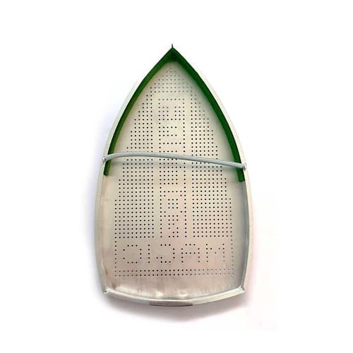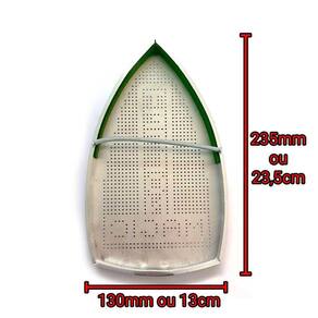 Sapata Anti Brilho Para Ferro Industrial de 2,5 KG- Estrutura em alumínio- Base de Teflon- Evita o brilho, derretimento de materiais e amarelado- Mola para acoplar no Ferro Industrial- Distribui melhor o vaporPara vários ferros, veja as dimensões na imagem