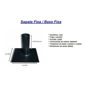 PRODUTO VENDIDO POR: PEÇA MATERIAL: AÇO TUBO: VAZADO ALTURA DO TUBO: 13CM CAPACIDADE DE CARGA: 4000KGF TAMANHO DA BASE: 110MM X 110MM ESPESSURA DA BASE: 05MM DIÂMETRO DO TUBO : 31MM