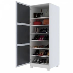 Marca: Gelius Material da estrutura: MDP 14 mm Acabamento: Pintura U.V. texturizada Material do fundo: MDF 3 mm Quantidade de portas: 1 porta Puxadores: Em alumínio Espelho: 3 espelhos com 3 mm de espessura Prateleiras: 7 prateleiras em MDP 14 mm Dobradiça: Metálica Informações complementares: Comporta até 40 pares de sapatos
