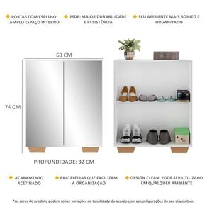 A Sapateira 2 Portas com Espelho Nina Multimóveis é produzida em MDP com acabamento acetinado (cerca de 20% de brilho), que garante maior durabilidade, facilidade na limpeza, além de um acabamento superior. Com 2 portas, possui um excelente espaço interno para acomodar seus sapatos e demais pertences (a prateleira interna suporta 8 Kg e o tampo 9 Kg). Os pés quadrados, em polipropileno, facilitam na hora da limpeza. Os espelhos na porta deixam o móvel mais requintado, criando um ambiente moderno e charmoso. Os espelhos são de vidro (o que evita que a imagem fique distorcida) e lapidados, ou seja, passam por um processo para que as bordas não fiquem cortantes, o que garante maior segurança. Compacta, é uma excelente opção para otimizar seu ambiente, para que você possa aproveitá-lo da melhor maneira possível.