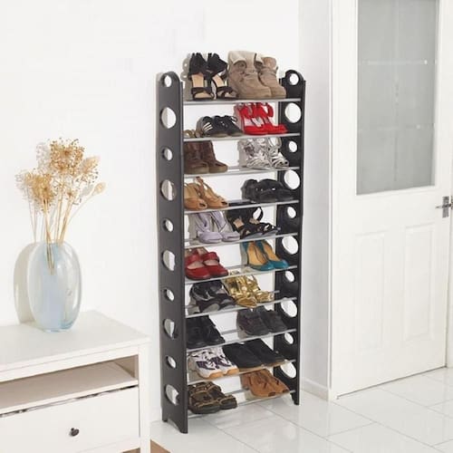 * Apresentando soquetes de trilho ajustáveis ??de três vias, trilhos antiderrapantes e um suporte lateral hermético, este rack é perfeito para botas, tênis, sandálias, saltos - tudo e qualquer coisa!