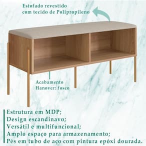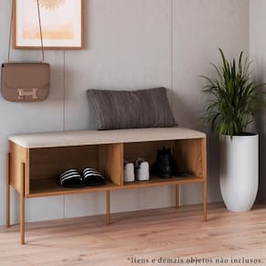 Sapateira Banco 93 CM Com Pés Em Metal Oslo 28968, possui estética escandinava, cores sóbrias e aconchegantes, juntamente com charme e elegância. Tem duas funções: sapateira, possibilita uma melhor organização para armazenar os calçados e como banco possibilita sentar-se enquanto calça ou descalça os mesmos. Produzido em MDP de 15mm com acabamento BP, conta com assento estofado revestido com tecido de polipropileno e pés de tubo metálico em aço com ponteiras plásticas para evitar atrito do móvel com o piso. Sua capacidade de peso suportado é de 106 Kg, sendo: 100 Kg no assento e 3 kg em cada nicho. Traz como característica um traço artesanal, minimalista e acolhedor, remete em suas linhas retas a simplicidade e funcionalidade que sua casa merece. Este produto chegará em sua casa separado em 02 volumes.