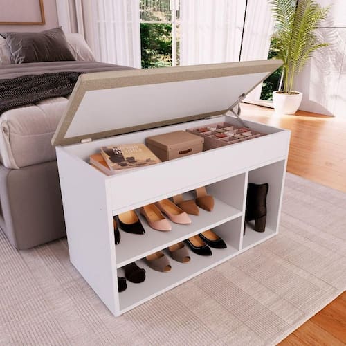 Sapateira Baú Com Tampo Estofado Completa Móveis Branco A Sapateira Baú Branco com Tampo Estofado da Completa Móveis é um produto versátil, ideal para organizar seu lar e valorizar a decoração da sua casa com grande estilo, pode ser utilizada em ambientes como: dormitório e hall de entrada. No dormitório, ideal para cama de solteiro, mas, podendo ser utilizada perfeitamente com cama de casal. Praticidade em guardar seus calçados e facilitando quando da colocação dos mesmos. Baú com tampo estofado o qual prático e confortável, bom para guardar não somente acessórios pros calçados, mas tmbém livros e outros pertences. Como hall de entrada, ideal para as mesmas praticidades e funções do seu quarto, além do charme e decoração! Largura - 81 cm Modelo - SP080BCBC Profundidade - 38 cm Altura - 48,5 cm Material Principal - MDP FF Acabamento - Fosco Necessita Montagem - Sim Cor Interna - Branco Cor Predominante - Branco Escala de Brilho - Fosco Quantidade Pés - 6 Ambiente Principal - Quarto Possui Gavetas - Não Possui Portas - Sim Quantidade de Portas - 1 Possui Prateleiras - Sim Quantidade de Prateleiras - 1 Suporta Até (kg) - 110 kg Sistema de Montagem - Parafusos + Cavilhas + Dobradiça Marca - Completa Móveis Mais Informações - Tecido Marrom Recomendação de Uso - Use um pano levemente umedecido com água, seguido de pano seco. Não utilize produtos químicos ou abrasivos. Origem do Produto - Nacional Peso - 18.27 kg Garantia do fabricante - 6 meses para defeitos de fabricação EAN - 7899671467884