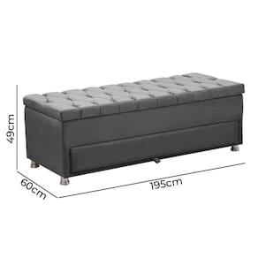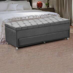 Características: Material da Estrutura: Madeira de eucalipto. Material e Densidade da Espuma: Poliuretano sem carga. Revestimento: Veludo Possui Pés: Sim. Tipo de Pé: Pé de plastico revestidos de metal com 5 cm. Possui Frame: não Tipo de Frame: não acompanha frame Pistões no baú: Sim Possui gaveta o baú: Sim