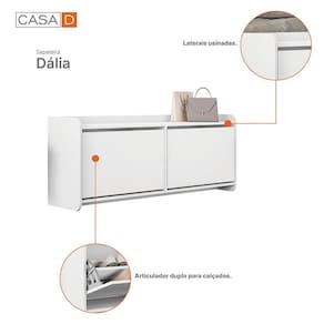 Sapateira Calçadeira Recamier Dália - Casa D A Sapateira Calçadeira Recamier Dália é a escolha ideal para quem busca funcionalidade e funcionalidade. Com estrutura em MDP e MDF, possui acabamento em pintura UV que garante resistência e durabilidade. Suas duas portas com articuladores duplos proporcionam praticidade no uso, enquanto as laterais usinadas com cantos arredondados conferem um design sofisticado. Além de ser um ótimo organizador para calçados e objetos, suporta até 80kg, tornando-se um móvel versátil para diversos ambientes.